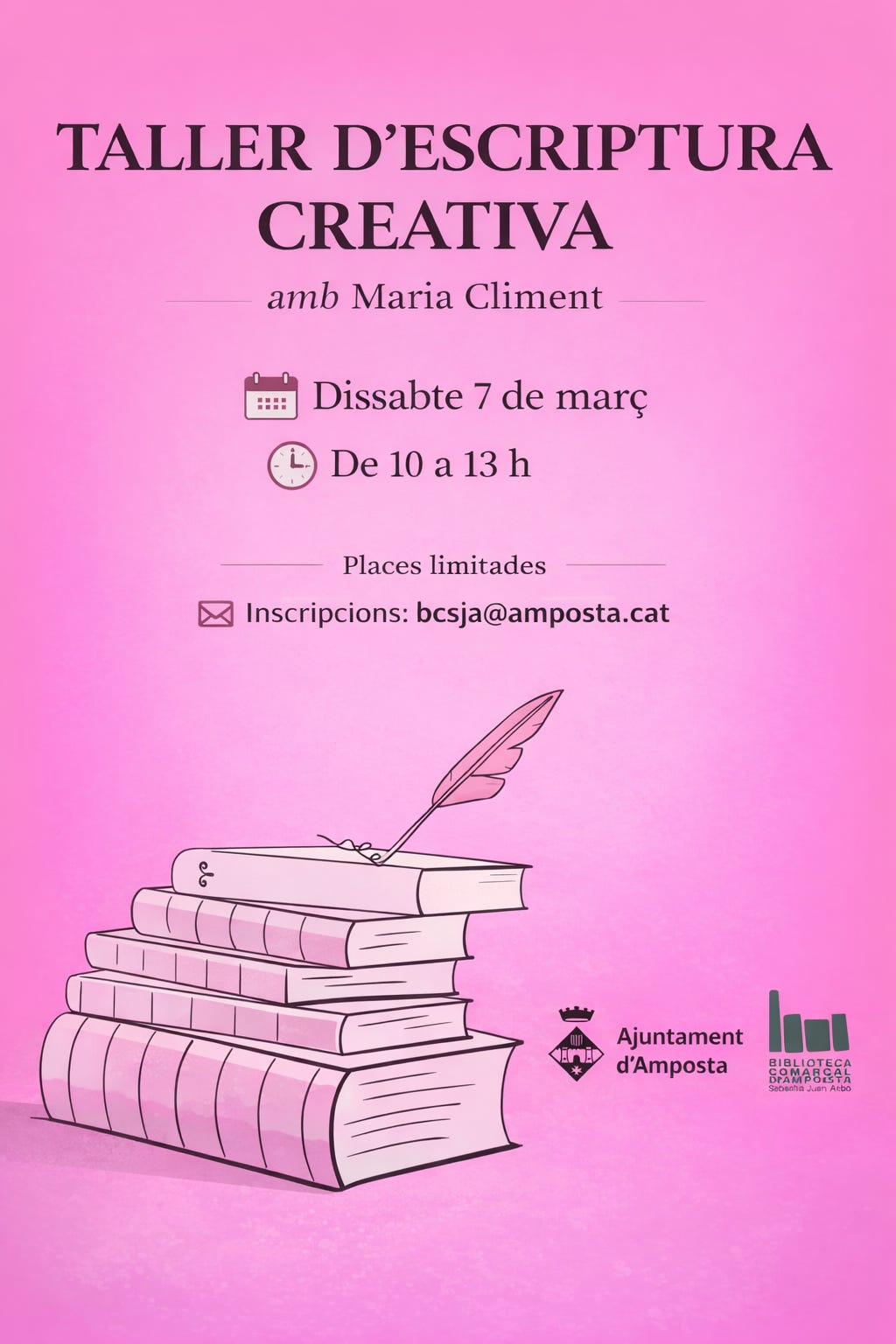 Ei! Com estàs? Només t’escric per informar-te, cas que t’interessi, que el pròxim 7 de març, de 10h a 13h impartiré un curs d’escriptura creativa (aquest és gratuït, gentilesa de l'Ajuntament d’Amposta) a la Biblioteca Sebastià Joan Arbó d’Amposta.